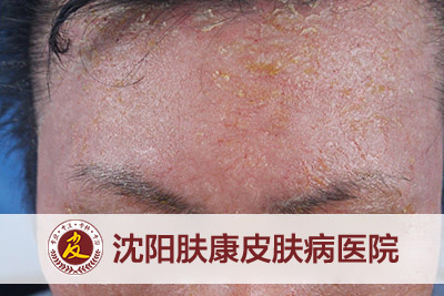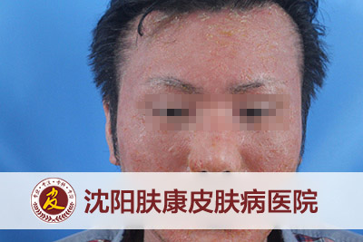 本文穿插的这些照片,就是阿汤哥来到沈阳肤康医院初诊时的照片。前面两张,一张是全脸的照片,另一张是额头、眼部病灶的特写。皮肤潮红,满脸结黄痂,看了之后就忍不住想动手,帮他把那许许多多的黄痂一点点抠掉……