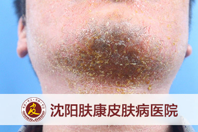 再看阿汤哥的下巴,斑斑驳驳的黄痂成片成堆!那些黄色痂皮,是之前每天渗出的黄水结晶而成的,干巴巴的痂皮高高翘起,那些胡子茬隐约可见……